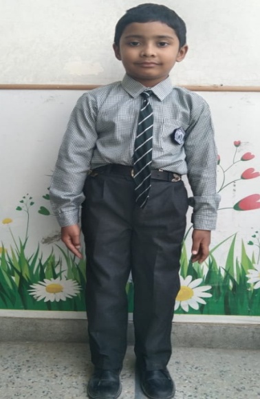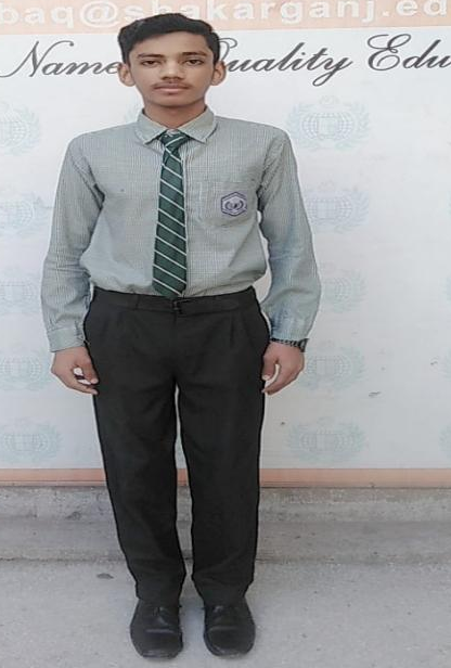 Green Check full Sleeves Shirt, Black Grey Pant. School Batch on Pocket. Green Tie with White Strips. Black simple Buckle belt, Black Socks, Black School Shoes with Laces. Soldier Hair Cut.